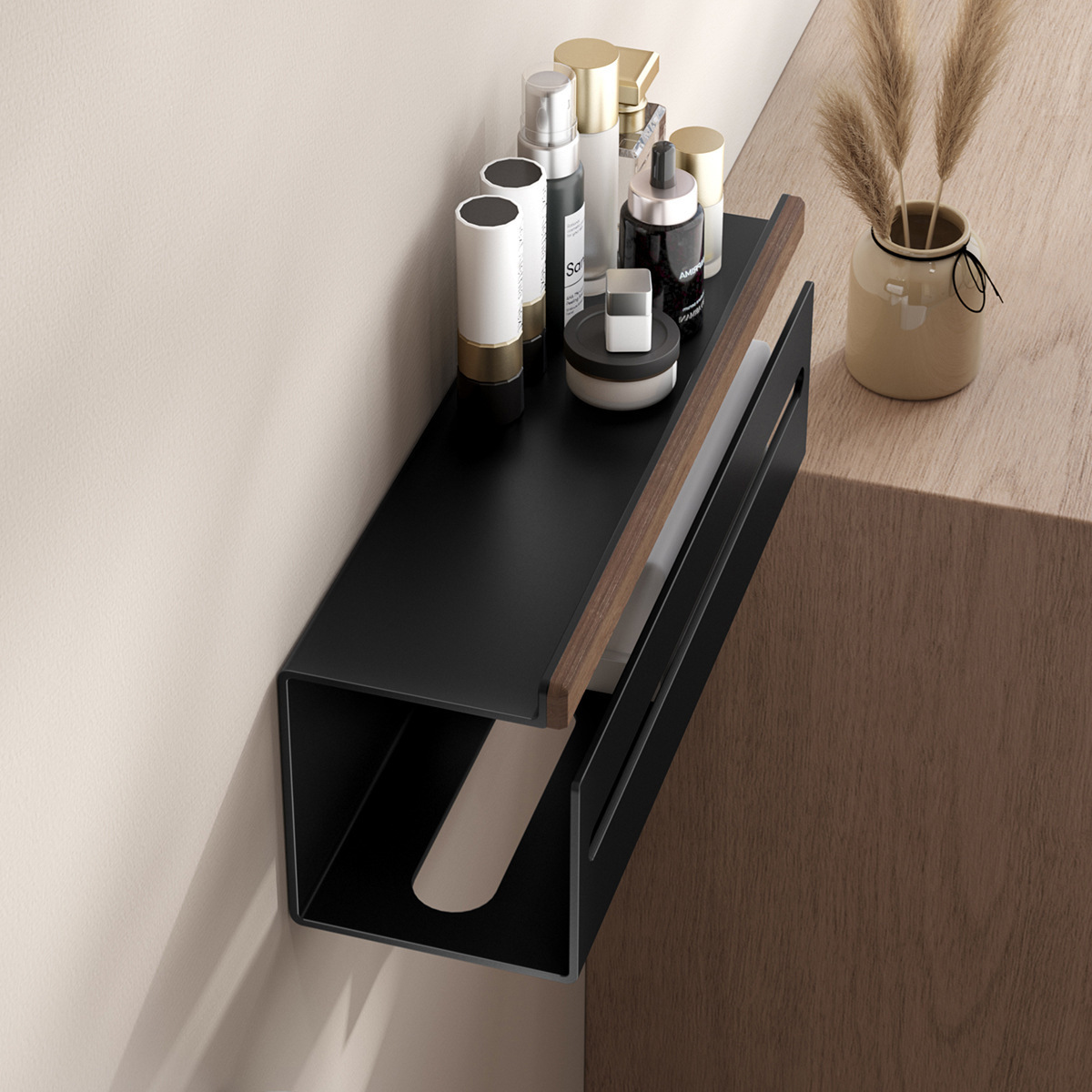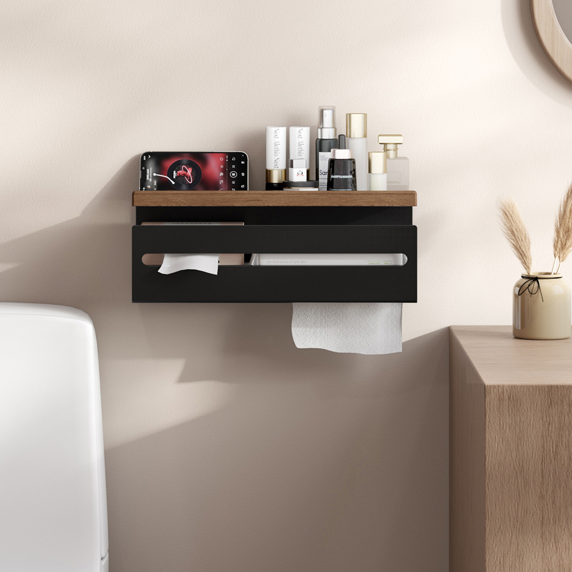 収納棚が付いた壁掛け式のトイレットペーパーホルダーです。