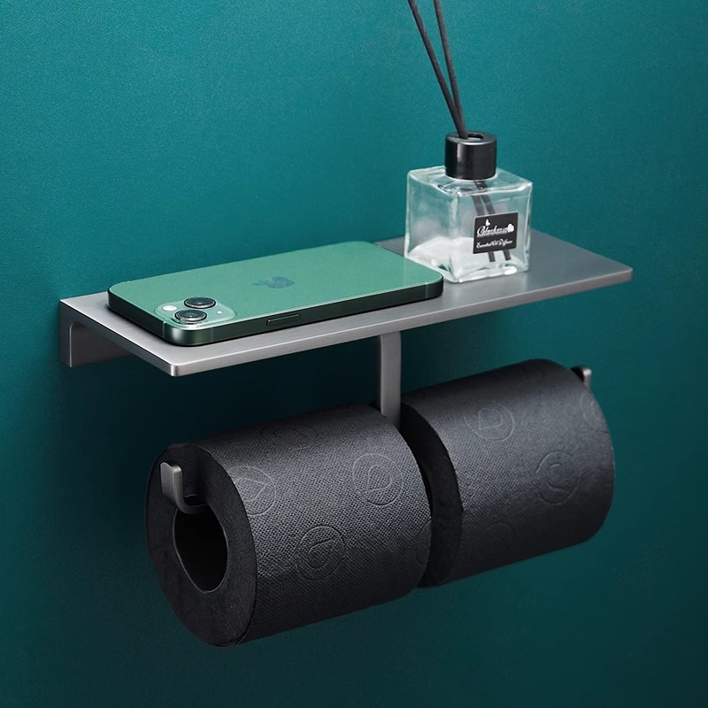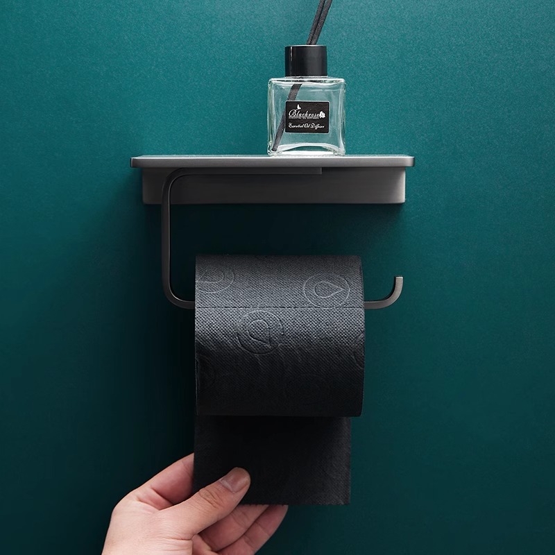 上部に小物が置ける便利な棚付きのトイレットペーパーホルダーです。